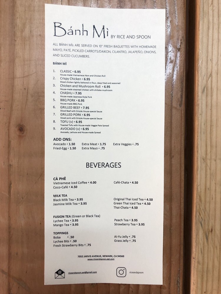 Introducing "Banh Mi by Rice and Spoon," a delightful Vietnamese eatery located at 7052 Jarvis Ave, Newark, CA. Specializing in vibrant and authentic Vietnamese sandwiches, this casual spot also boasts an enticing menu of soups and appetizers, perfect for lunch or a relaxing dinner.